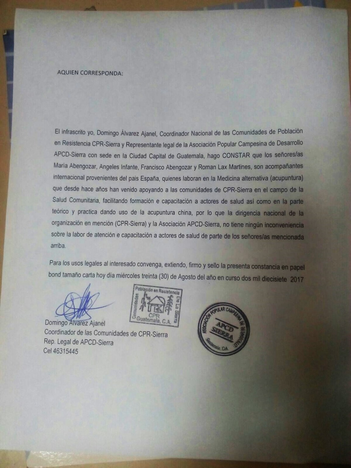 El infrascrito, yo Domingo Álvarez Ajanel, Coordinador Nacional de las Comunidades de Población en Resistencia CPR-Sierra y representante legal de la Asociación Popular Campesina de Desarrollo APCD-Sierra, con sede en la capital de Guatemala, hago CONSTAR que lxs señorxs María Abengózar, Ángeles Infantes, Francisco Abengózar y Ramón Lax, son acompañantes internacionales provenientes del país España, quienes laboran en la Medicina Alternativa (Acupuntura), que desde hace años han venido apoyando a las Comunidades CPR-Sierra, en el campo de la salud comunitaria, facilitando formación y capacitación a actorxs de salud, así como en la parte teórico y práctica, dando uso de la acupuntura china, por lo que la dirigencia nacional de la organización en mención, CPR-SIERRA y la Asociación APCD-SIERRA, no tienen ningún inconveniencia, sobre la labor de atención e capacitación a actorxs de salud de parte de lxs señores y señoras mencionadas arriba.